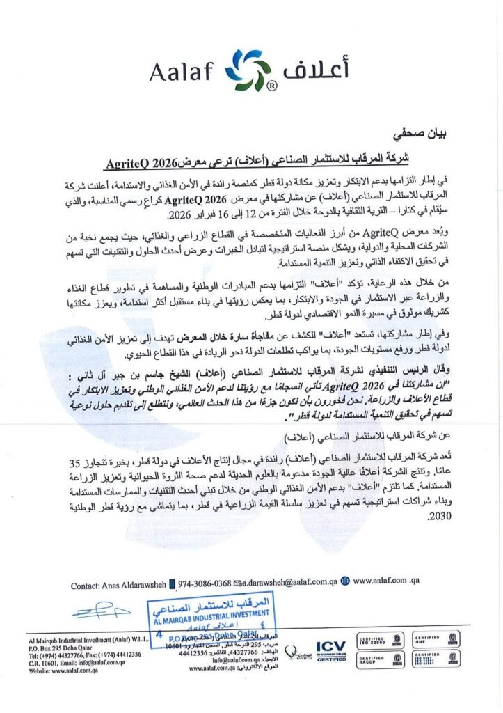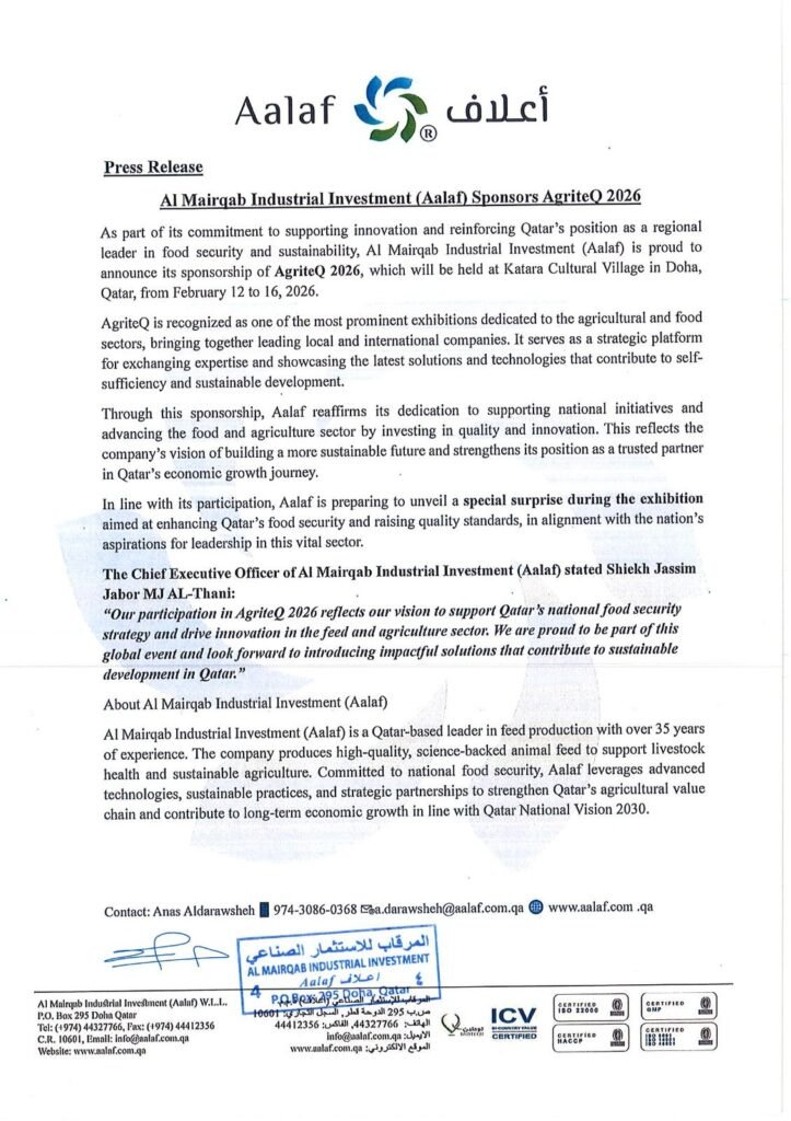 We are proud to announce that Al Mairqab Industrial Investment (Aalaf) is an official sponsor of AgriteQ 2026, Qatar’s leading international agricultural exhibition. This partnership reflects our commitment to advancing innovation, sustainability, and food security across the region.
