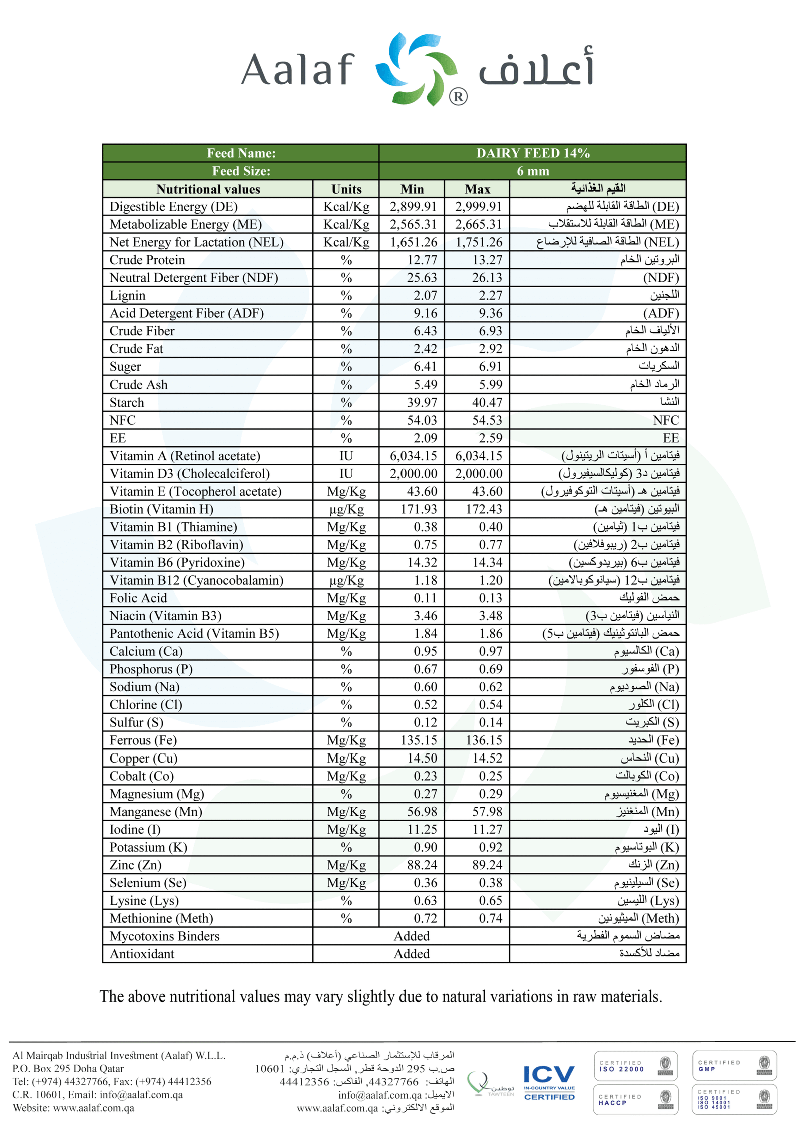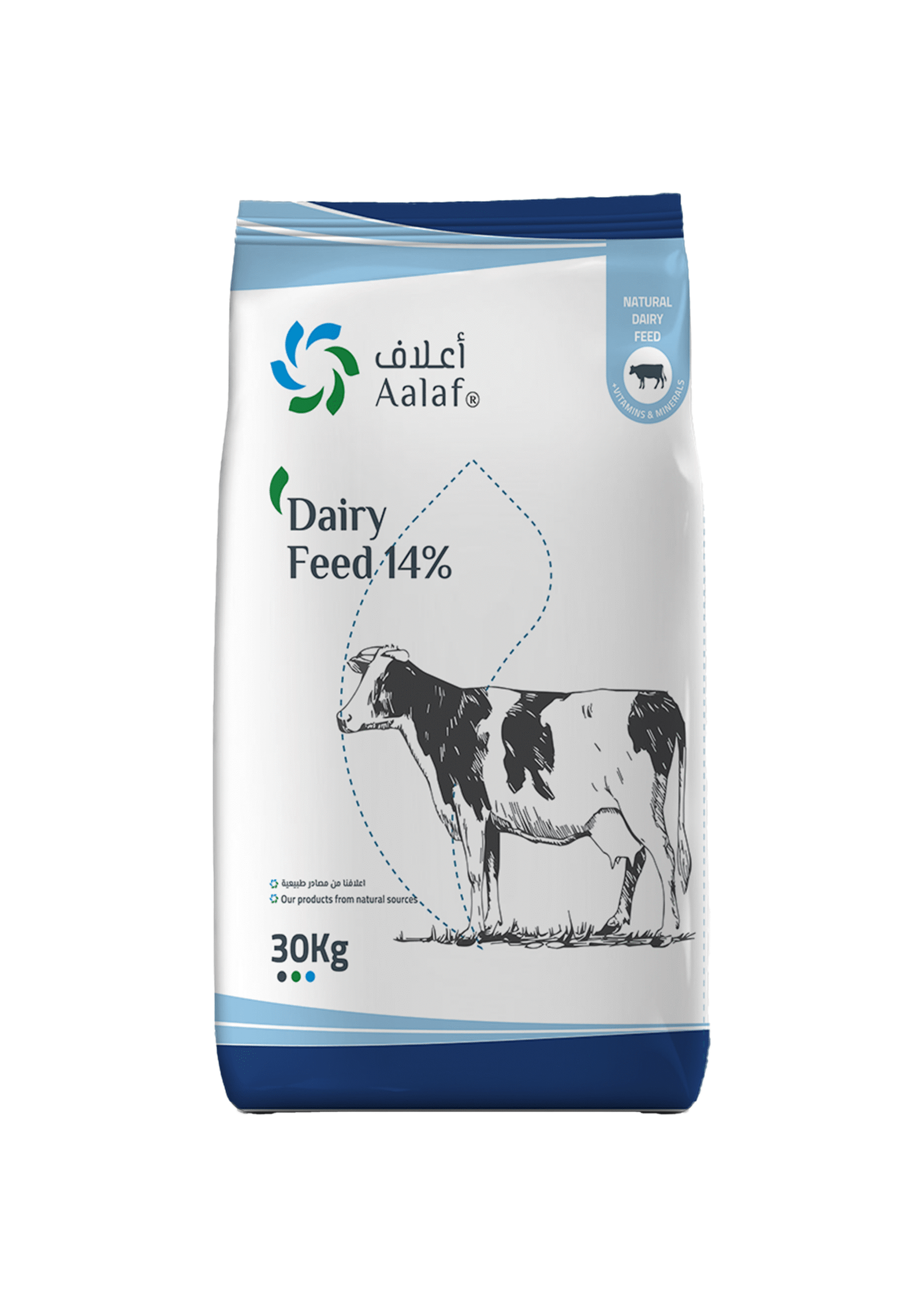 علف أبقار حلوب بنسبة بروتين 14% مخصّص لفترة منتصف الإدرار، يدعم وظيفة الكرش ويحافظ على الحالة الجسمية لإنتاج منخفض إلى متوسط.
