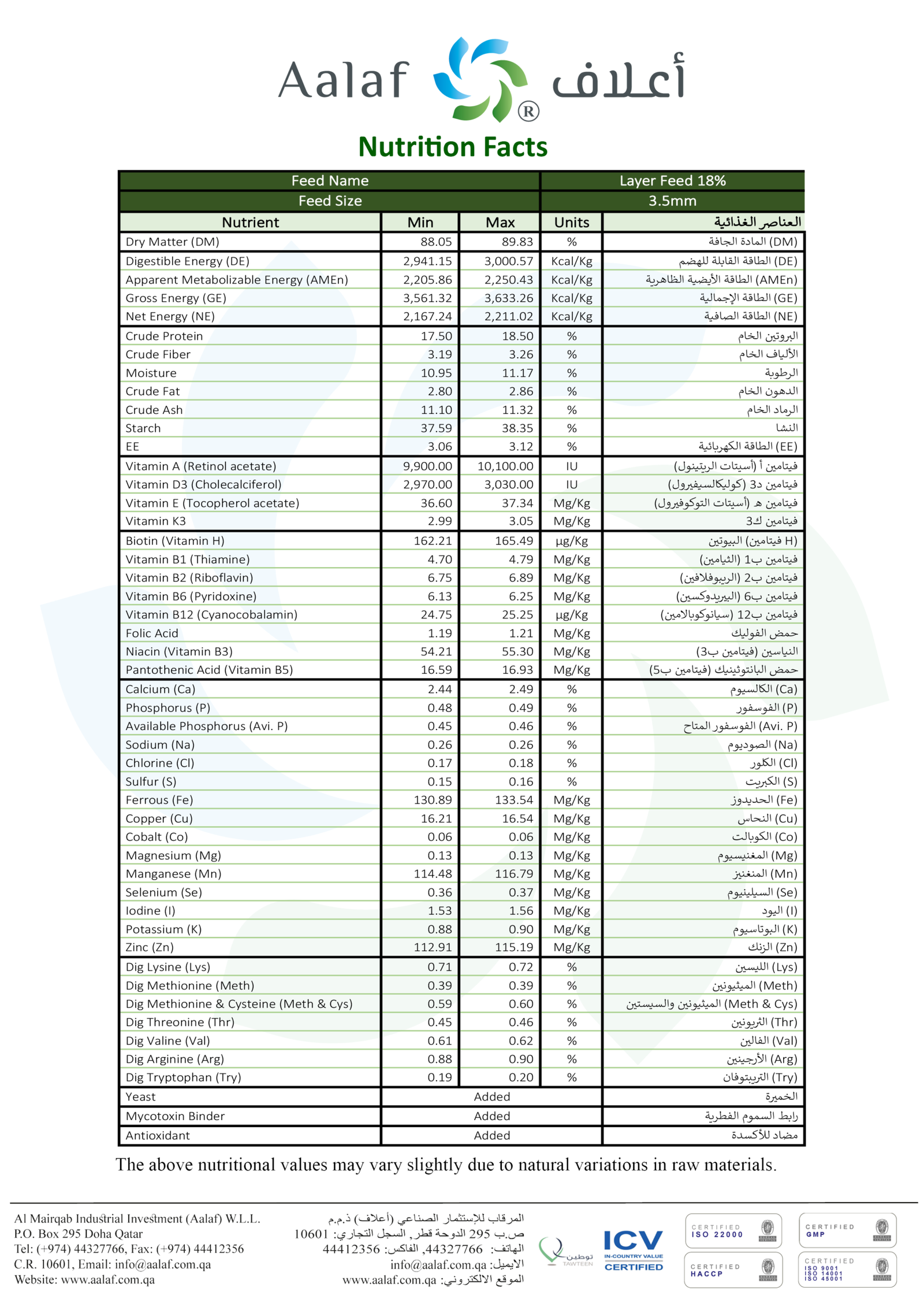يتم إنتاج علف بيّاض أعلاف 18٪ في منشآت تطبّق ممارسات التصنيع الجيد (GMP) وحاصلة على شهادة ISO 22000 لنظم إدارة سلامة الغذاء. كما تتبع عملية الإنتاج مبادئ HACCP للسيطرة على مخاطر سلامة الغذاء. وتضمن هذه المعايير إنتاجًا آمنًا، وجودة ثابتة، وتغذية موثوقة في كل دفعة إنتاج.